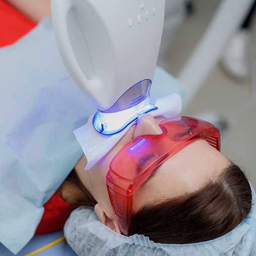 En consulta: Este tratamiento de blanqueamiento dental en Jalón consiste en la aplicación de un producto blanqueador sobre la superficie de los dientes a blanquear, este producto es activado mediante una lámpara especial que emite una luz fría de alta intensidad; previamente colocamos un gel protector en las encías para evitar cualquier molestia derivada del procedimiento. Se realizan dos sesiones de 30 minutos en días diferentes, durante las cuales se realizan de 2 a 3 aplicaciones del agente blanqueador.